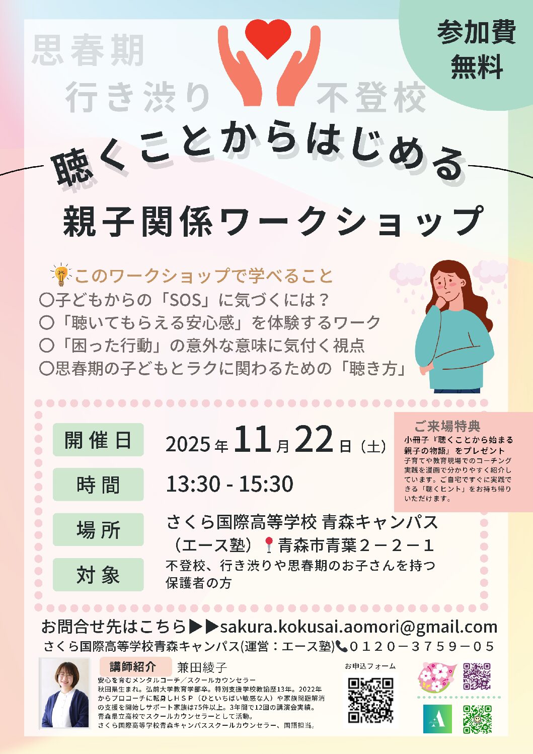 青森市には学校、スクールカウンセラー、教育委員会が設置する居場所などの公的な相談先がありますので、積極的に利用したいものです。